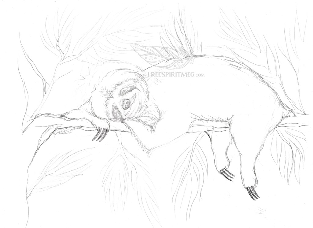 This is my rough sketch. I don’t think sloths really sleep like this but I wanted to play off of their lazy-like appearance. I’ve been really tired lately between work, family, summer activities and staying up later than I probably should. When I look at this, I can just imagine taking a nap in the trees with a nice, cool breeze. That would be the life, am I right? I think it’s safe to say we have all been there.