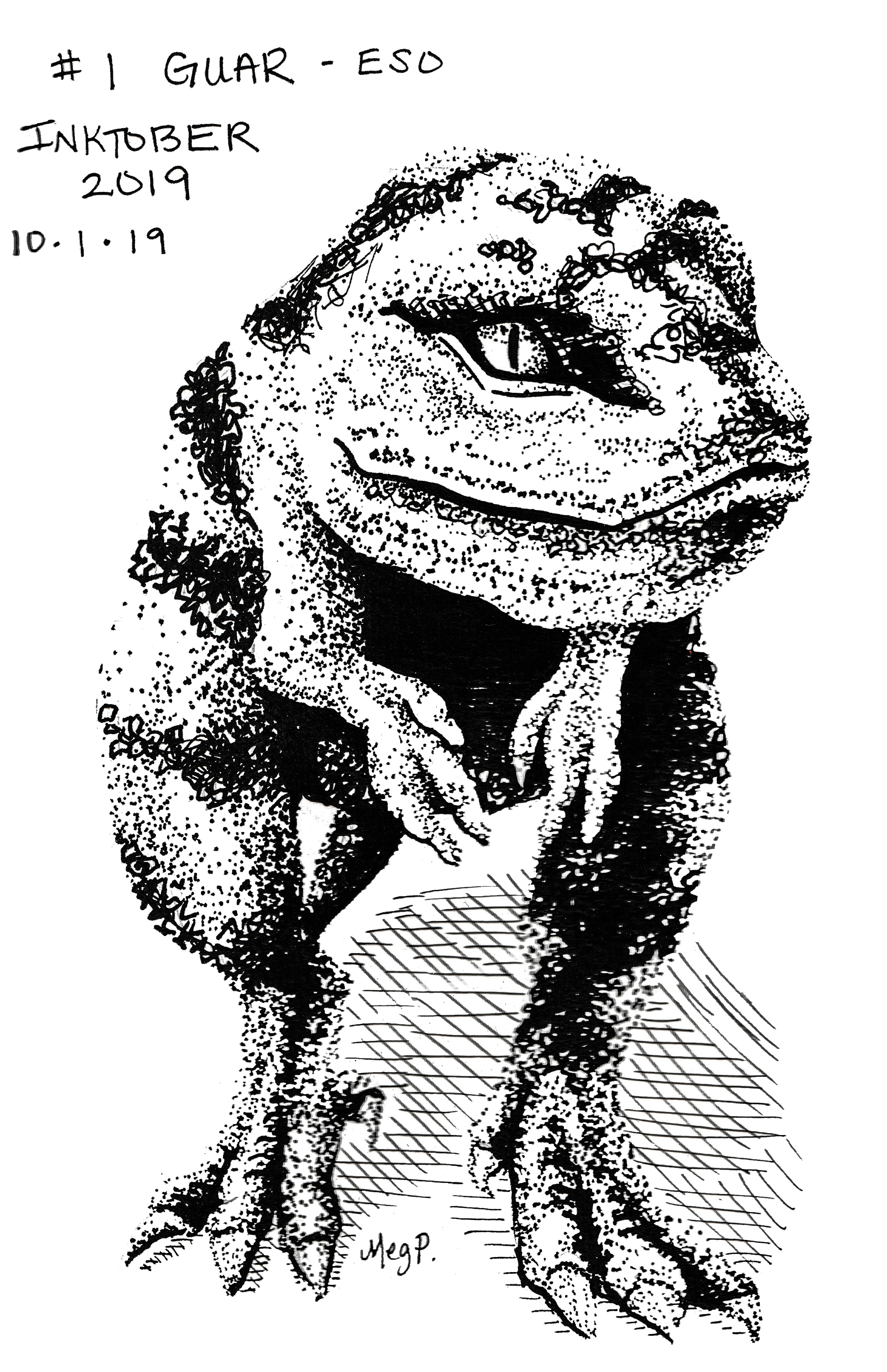 Inktober has begun! This year, I have decided to follow a different prompt list from the official one. I am following a list created by The Elders Scrolls Online, which is a fantasy based video game. I don’t often give myself the opportunity to draw this subject even though I really enjoy it. I figured this would be a good way to scratch that itch. The first day’s prompt is a guar, a reptile-like creature.