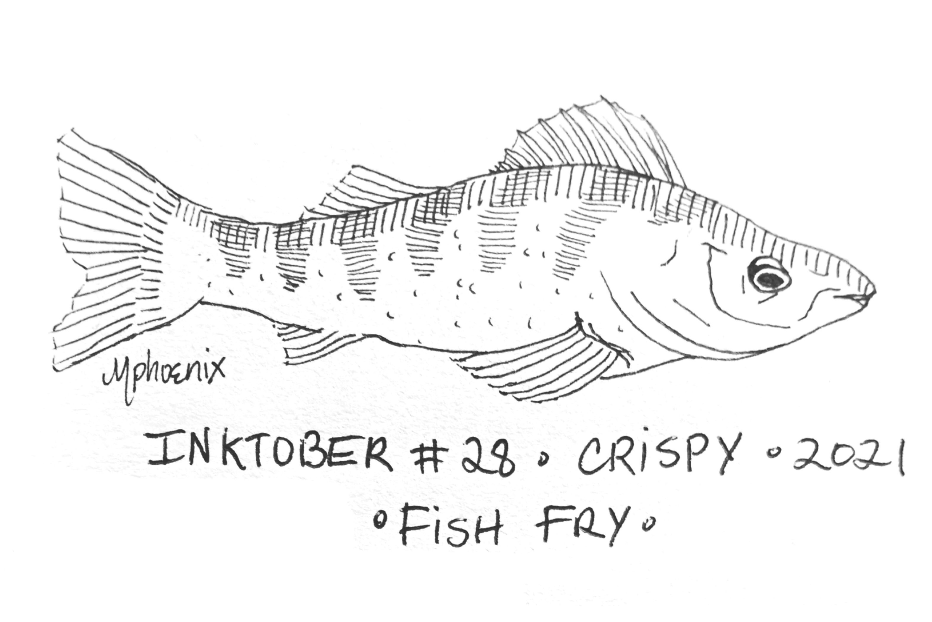 I drew a perch for this prompt because one of the things I’m going to miss is my dad’s fish fry! You may have read in a previous Inktober post that my family and I would often take my dad’s boat out on Lake Erie. We would spend all day in the sun, fishing for perch. Whatever we caught, we would bring back home and fry them up for one of my favorite meals of all time. My dad would take care of the fish and my mom made this home made tarter sauce. Together, it was sooooo goood. I never even remember what the sides were because I was so focused on the fish.