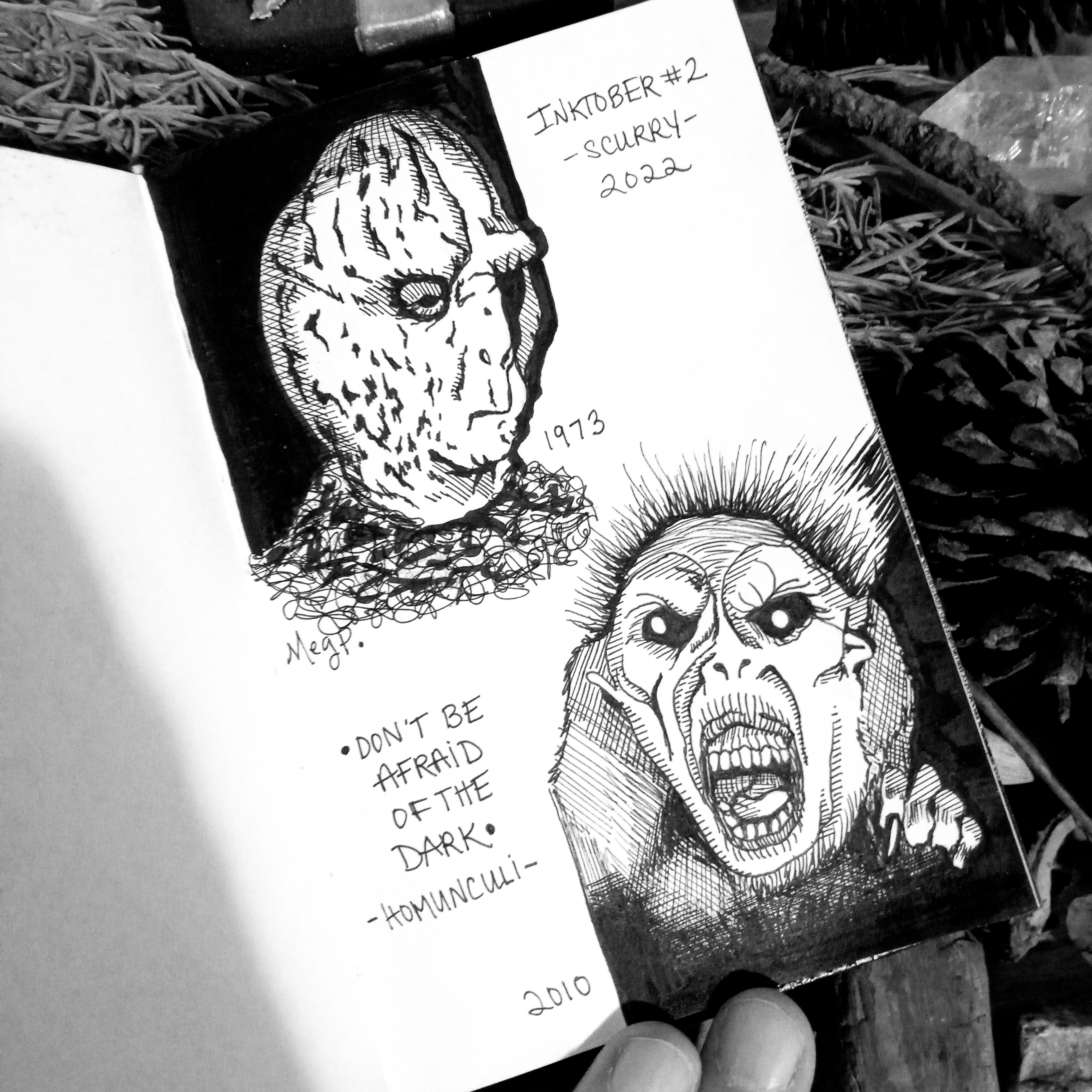 The second Inktober prompt is “scurry”. This was an easy prompt to come up with a horror movie. Several movies came to mind of eerie little critters scurrying around. Gremlins, Critters, They, Graveyard Shift… the list goes on. The one I settled on for my sketch was “Don’t be Afraid of the Dark”.