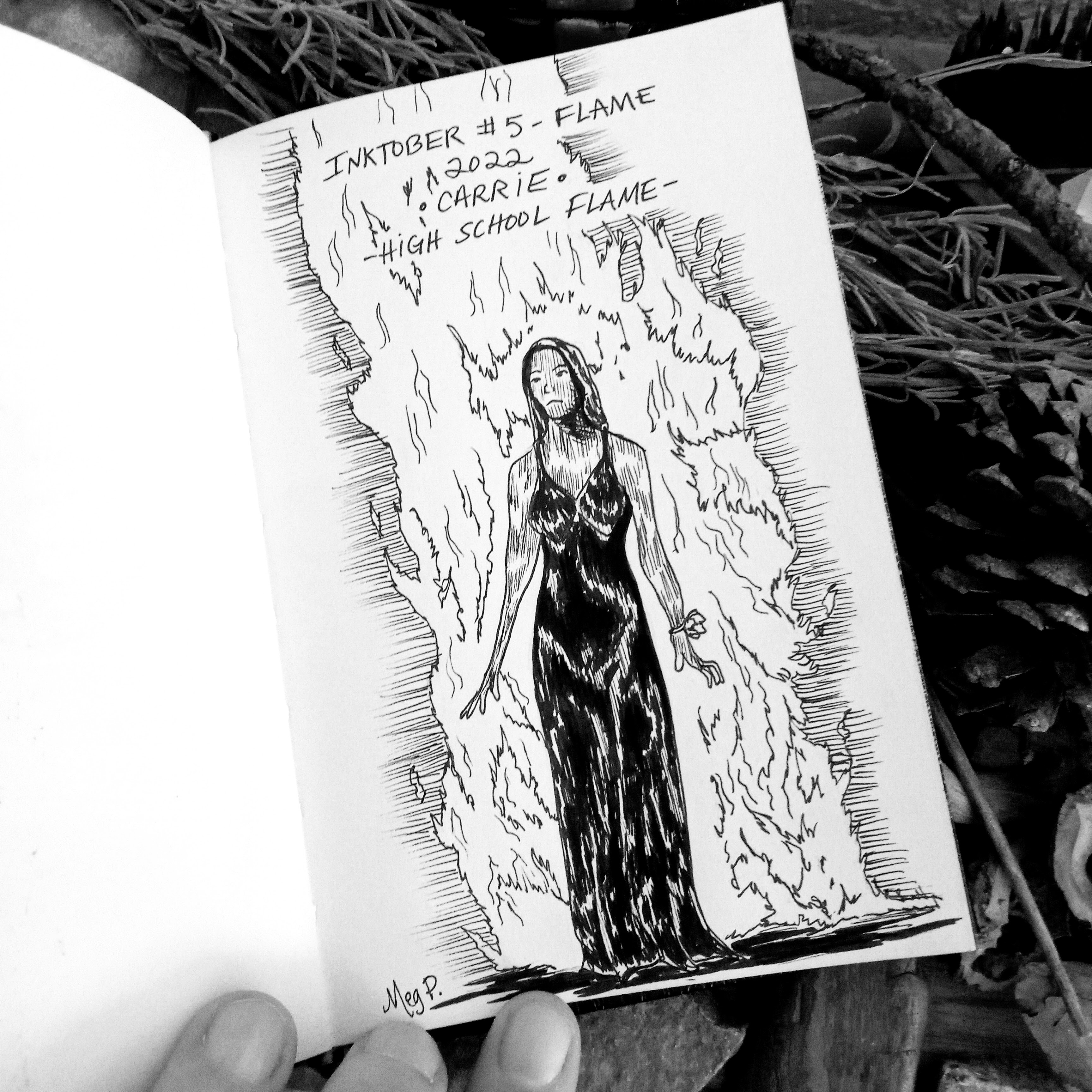 This is my favorite sketch that I have shared with you so far. I have never quite mastered drawing fire. It has always been a struggle for me to make it look realistic. I also wasn’t sure how I was going to make it look like Carrie (spoiler alert) had been drenched in pigs blood either, especially with a black and white sketch. However, I just went for it and hoped for the best. I am pretty pleased with how it came out. I’m quite proud of how I captured the scene. Not to mention, I am not the best at drawing people which is a yearly struggle for me when Inktober rolls around. Although, you will never get better at something if you don’t try. So in the end, one of the most challenging sketches has turned out to be one of my best for this years Inktober.